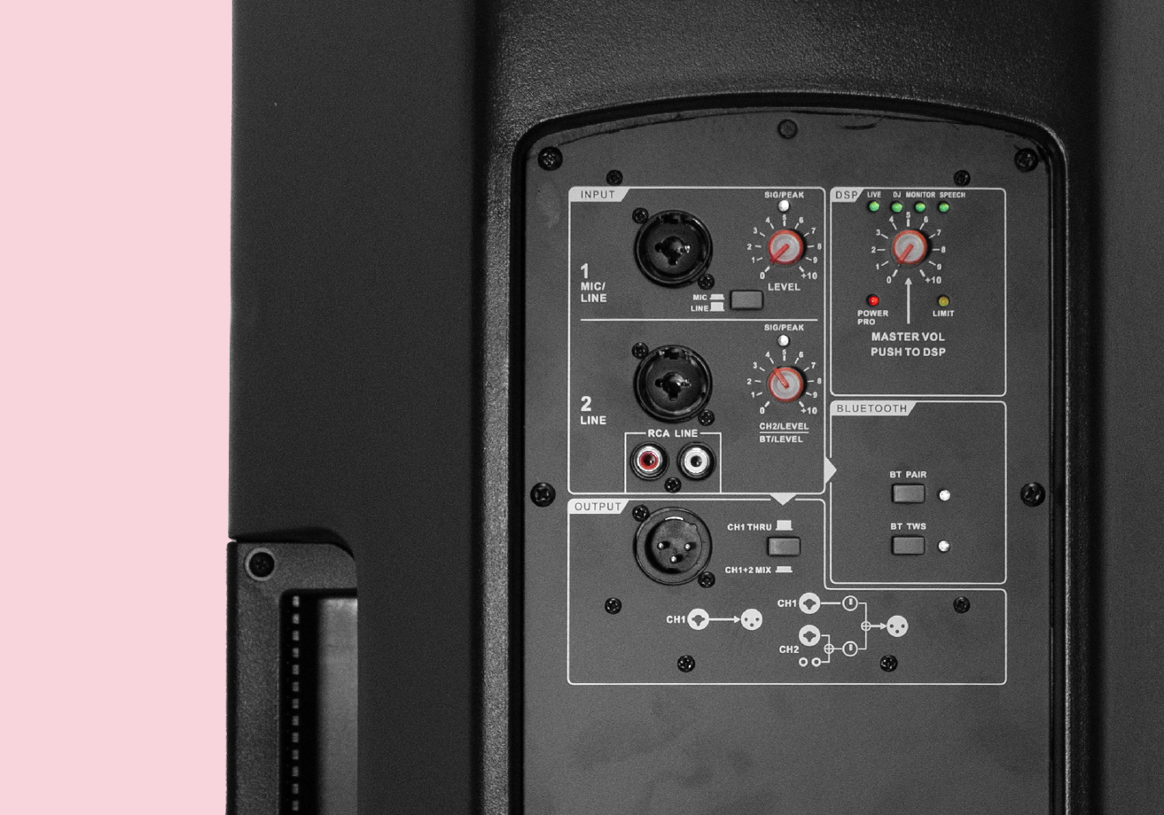 2 entrada profesional XLR, entrada TS, entrada de línea 3.5mm, 1 salida profesional XLR